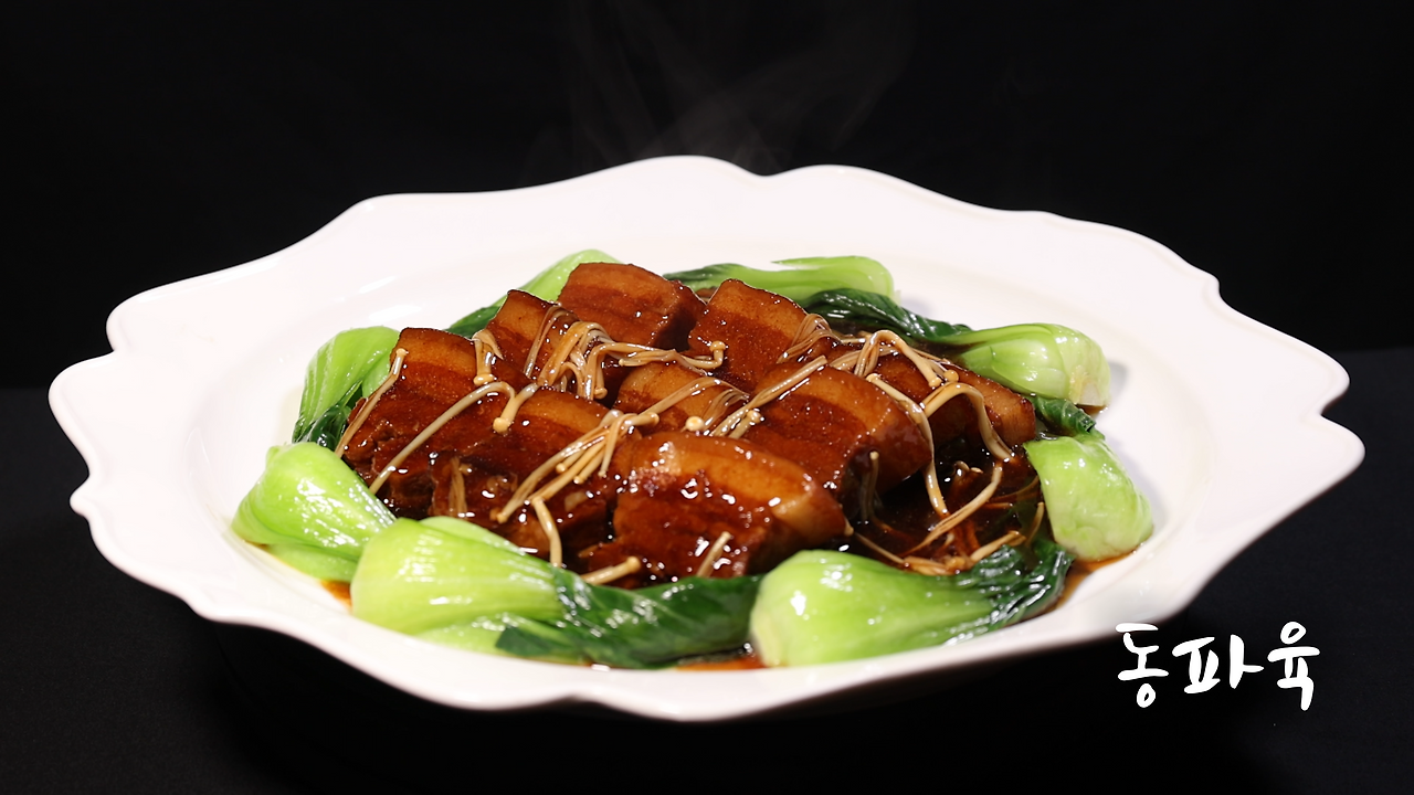 4. 청경채는 기름에 살짝 볶아 접시에 담아내고, 동파육을 우린 간장 소스에 전분물을 풀어 고기 위에 부어 완성한다.